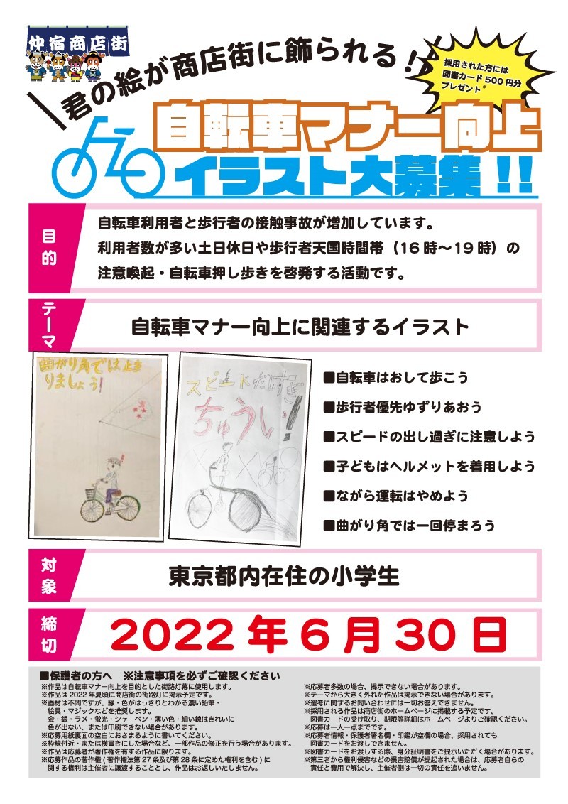 ここ最近、商店街内での自転車と歩行者、自転車どうしの接触トラブルが多発しています。そこで、仲宿商店街の取り組みとして「自転車マナー向上ポスター」を製作いたします。自転車の押し歩きや注意喚起など、自転車に乗る際のルールやマナーを啓発するために、子供の描いたイラストを取り入れて街路灯に掲示します。